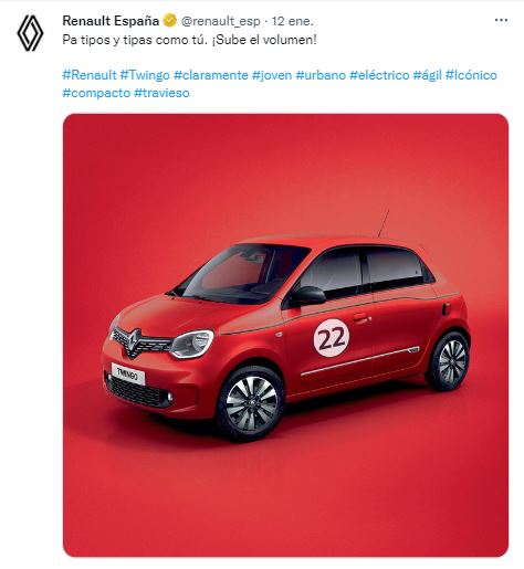 Renault España aprovechó la tendencia para promocionar el lanzamiento de la versión eléctrica de su icónico diseño. En la imagen puede verse el modelo Twingo con el número 22 estampado en la puerta del vehículo, haciendo referencia a la edad de la nueva novia de Piqué. “Pa tipos y tipas como tú. ¡Sube el volumen!”, dice el tuit haciendo referencia al tema.